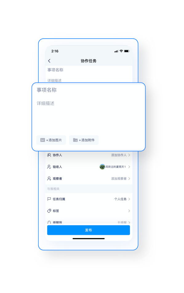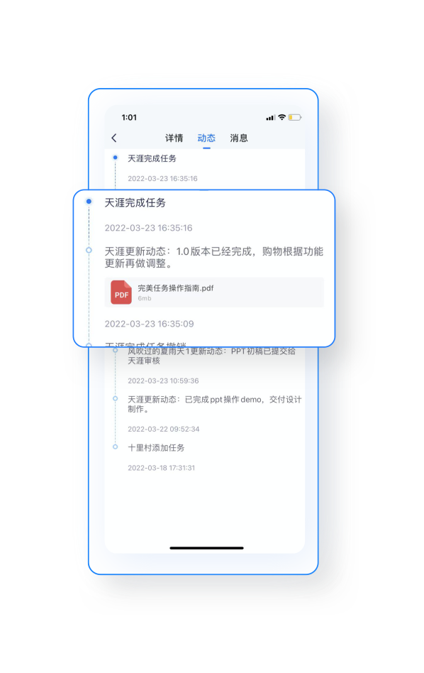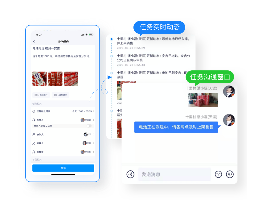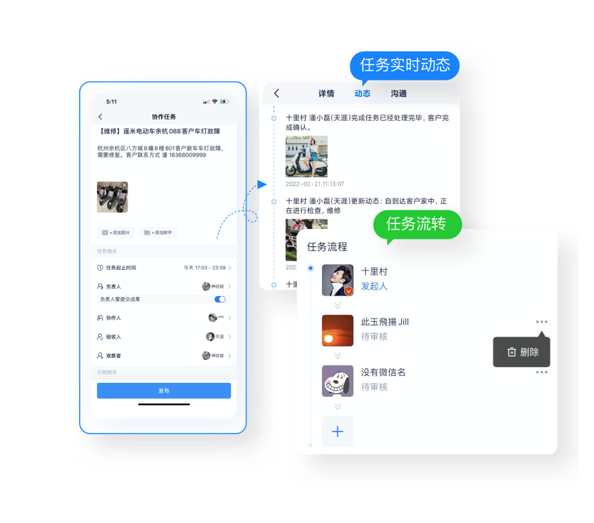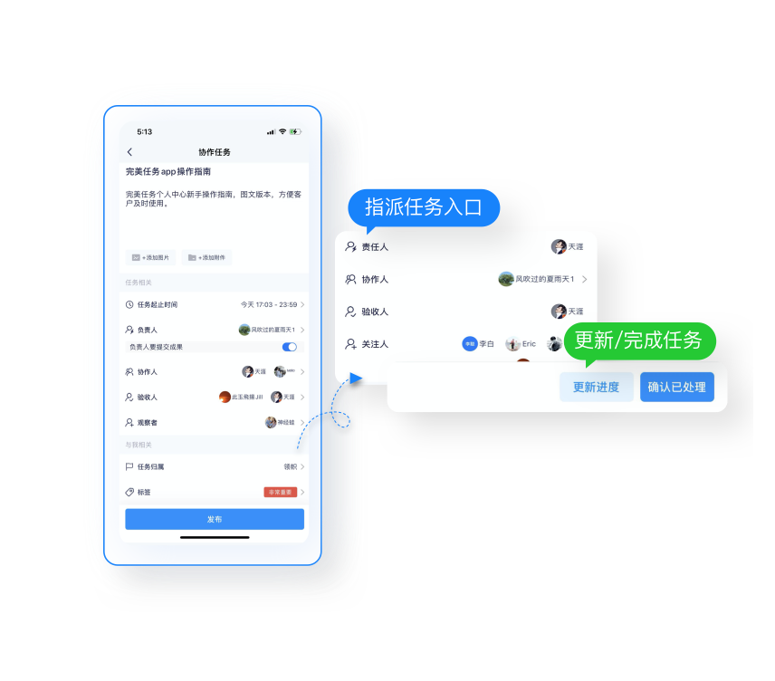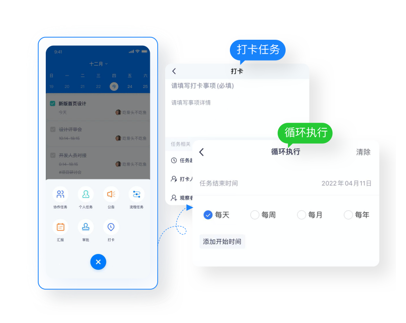 企业所有员工都可以围绕企业日常会议、审批、汇报、打卡、面试、评审、设计、开发、培训等各种场景创建任务,方便团队协作、任务跟进。